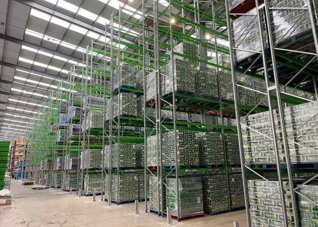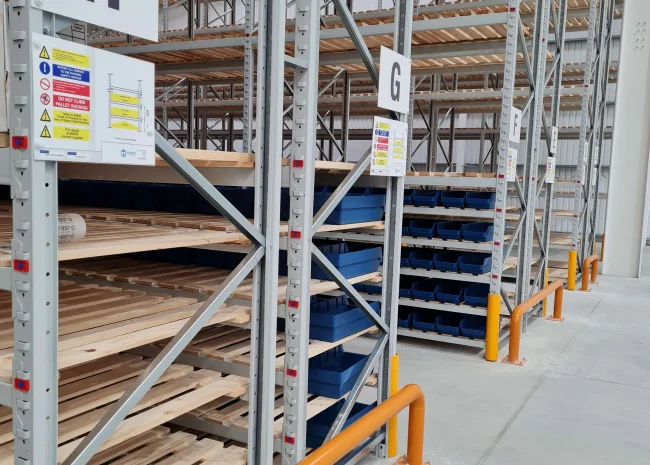 Push-back racking which is perfect for storing medium-turnover products. With this system, pallets are stored on either rollers or trolleys that are pushed back when storing product, then moving forward when the front load is retrieved.